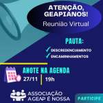 A Associação A GEAP É NOSSA convoca todos os ASSOCIADOS, beneficiários da GEAP, para participarem da Reunião Virtual, para discutir sobre os descredenciamentos da rede de prestadores. A reunião virtual será na próxima quinta-feira (27/11), às 19 horas, via plataforma Google Meet. Importante: O link da sala virtual da reunião será enviado para o e-mail do associado…