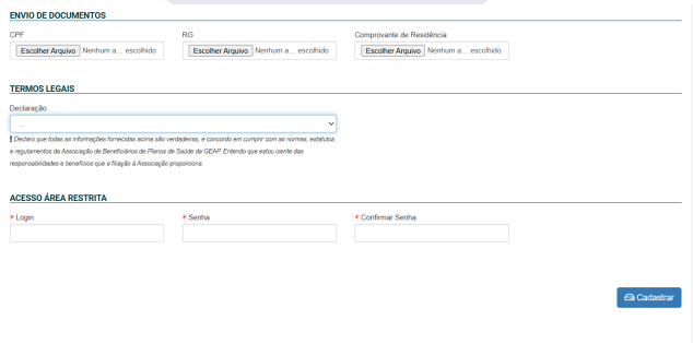 • No campo ACESSO ÁREA RESTRITA preencha os campos login e crie uma senha.